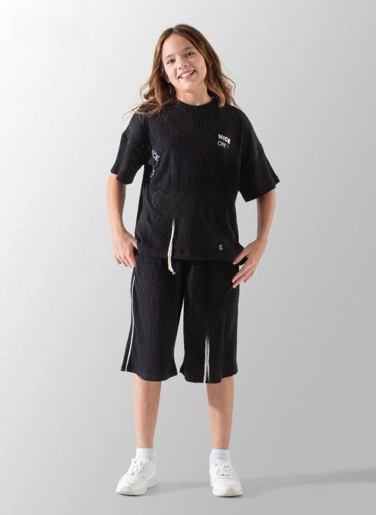 This is a stylish and comfortable summer set for girls, perfect for a modern and relaxed look on warm days.